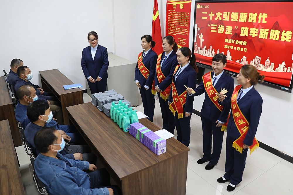 为把党的二十大精神转化为干部职工自觉行动和积极有效的工作措施,立足岗位尽职尽责,坚决打赢安全生产“三步走”目标行动攻坚战,双龙公司用柔性力量护航矿井安全生产,组织巾帼志愿者深入科区开展党的二十大精神宣讲及安全知识征答活动。巾帼志愿者从党的二十大会议盛况、主要成果、二十大报告主要精神进行了深入解读,让大家全面、准确、系统性地领会党的二十大精神。随后开展的安全生产相关知识争答掀起活动的高潮,职工们踊跃抢答,气氛热烈,营造了浓浓的安全氛围。(撰稿:张双侠、郑海珍 审核:赵素萍 )