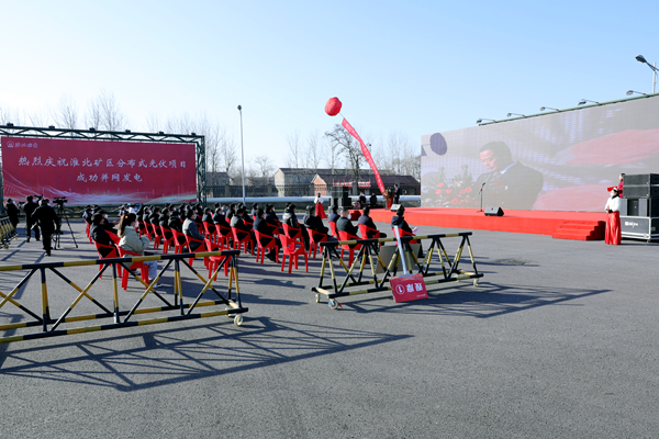 淮北矿业集团党委常委、淮北矿业总经理葛春贵宣布淮北矿区分布式光伏项目成功并网发电,并和集团相关部门负责人,承建单位代表中能建江苏电建三公司、中冶武勘研究院相关人员一起,启动并网发电“金手掌”。