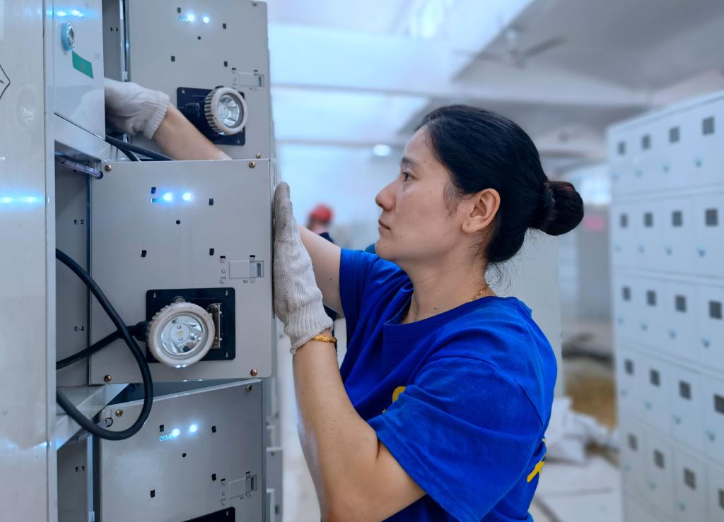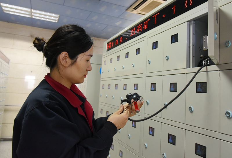 灯房班班长郑班班在巡检智能化矿灯灯柜。走进芦岭矿灯房,首先映入眼帘的是整洁明亮的大厅,整齐划一的矿灯架。每天都能看到灯房班女工在矿灯架中忙碌的身影,他们负责维护全矿2200盏矿灯和自救器检测,为矿工兄弟保驾护航。