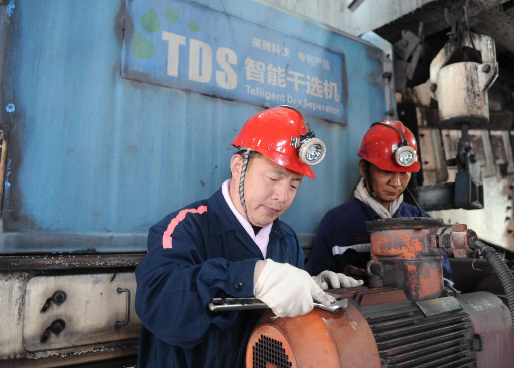 保运区保运队队长王记勇在更换TDS震动布料皮带电机风叶罩,确保设备正常运转,杜绝生产事故影响,为矿井安全生产保驾护航。