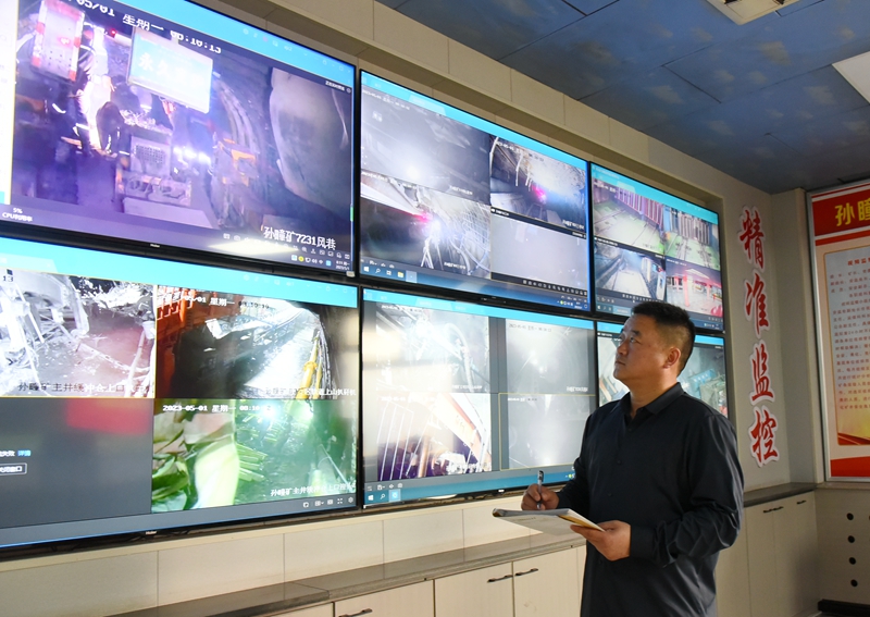 “我是来自安监处的一名安监员,我叫朱杰。对于我们来说,抓安全没有节假日,过不过节都一样。从早上7:00接班到现在,还没有发现有违章的。”5月1日,8:17分,在孙疃矿井口视频监控室,朱杰两眼紧盯视频画面,一边回答笔者的提问。“看视频,最大的难题在哪里?”“监控室要查看24个画面,眼睛要不停地来回看。就拿7₂31风巷来说,受特殊地质条件影响,他们在割窑以后,要用U型梁子支护顶板,这时就需要时刻盯着。以防出现违章。”