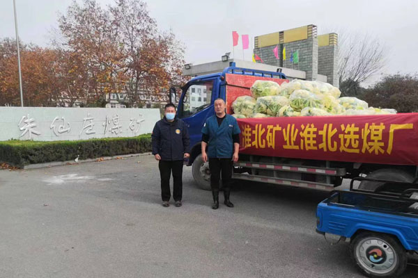 11月25日,一辆悬挂“淮北矿业淮北选煤厂、齐心共抗疫,携手向前行!”横幅,满载着一袋袋花菜的货车,缓缓驶入桃园矿南大门……