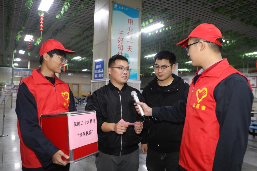 为进一步检验广大党员干部职工对党的二十大精神掌握和理解,帮助大家进一步巩固学习成果,该矿组织党团志愿者在干部职工交接班、集中就餐等人员集中时段,分组前往基层科区、入井走廊和职工食堂,随机邀请过往干部职工参与党的二十大精神快问快答,以随机方式,精准检验学习效果。对于在抽查提问中答得对、答的快职工,志愿者现场给予相应激励,答不上来的则会获得一次“一对一”辅导机会,及时帮助大家差缺补漏,增进理解,确保党的二十大精神在全矿上下入脑入心。