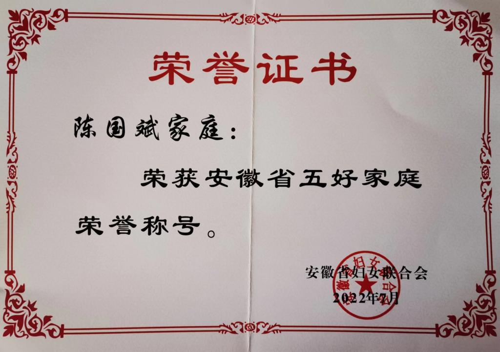 前不久,临选厂职工陈国斌家庭被安徽省妇女联合会授予安徽省五好家庭荣誉称号。