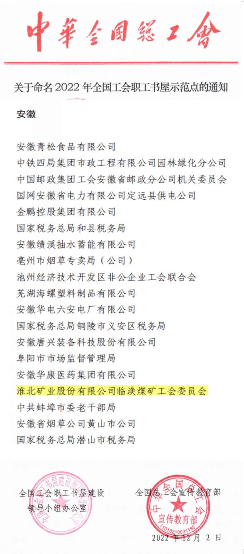 临涣矿荣获“2022年全国工会职工书屋示范点”称号