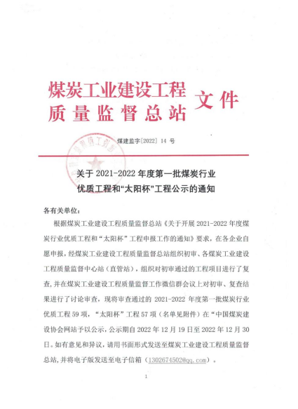 “太阳杯”工程是煤炭行业建设工程质量最高奖,有全国煤矿建设“奥斯卡”之称。该奖项由中国煤炭建设协会会同煤炭工业建设工程质量监督总站负责组织各有关质量监督中心站及有关专家进行工程复查和评审工作,以把关严格、标准高著称。