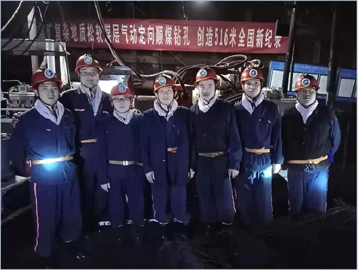 由于机组内青年职工较多,该机组针对青年人敢想、敢闯、敢干,学习力强的特点,积极推进“创新型”机组建设。2021年,该机组施工的孙疃煤矿1019工作面定向高位钻孔最大孔深达到825m,创造了大孔径定向高位钻孔淮北矿区施工纪录。2022年1月1日,在施工神源煤化工7703风巷顺煤层定向钻孔中,该机组以单孔深516米创全国新纪录。该工程施工的钻孔强化了7703风巷条带瓦斯的抽采,大大缩短了瓦斯治理时间,对煤层剖面进行了精准探查,减少7703风巷掘进期间地质探查6至8次,实现了巷道的安全连续高效施工,攻克了碎软煤层顺层定向钻进的成孔、护孔、跟层等诸多技术瓶颈,为实现“以钻代巷”定向顺煤层条带消突技术奠定了基础,为淮北矿区瓦斯治理提供了安全经济高效的新方案。