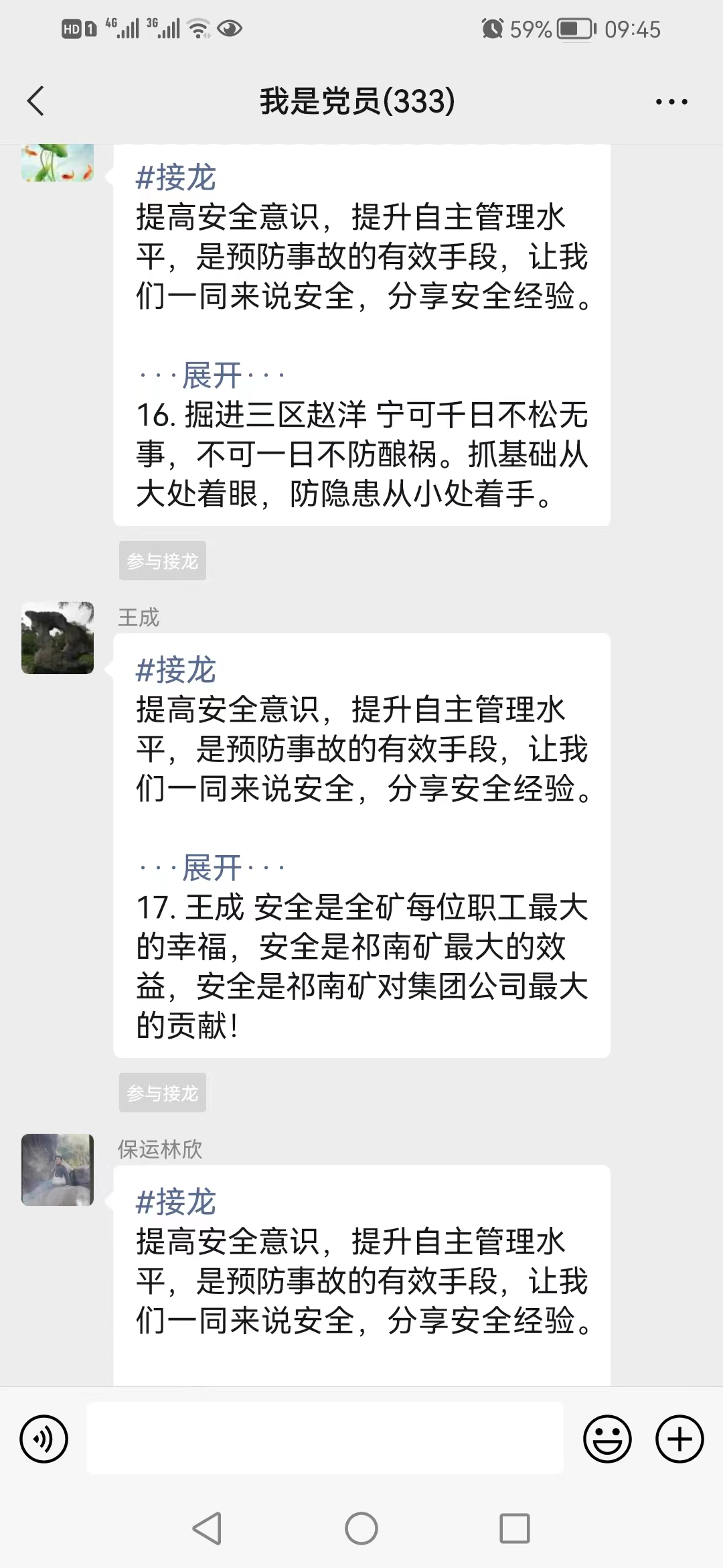 为提高党员安全意识,连日来,祁南矿利用“我是党员”微信群在全矿党员中开展“安全”接龙活动,发起人以安全为中心话题发起接龙,群内党员结合岗位实际和岗位安全生产责任制提安全建议,说安全体会,谈安全感想,讲安全预防措施。接龙内容可以是安全警句、格言,安全顺口溜,也可以是做好安全的建议和经验;可以是自己对自己的安全提醒,自己对他人、班组、区队的安全提示,也可以是自己的操作经验。