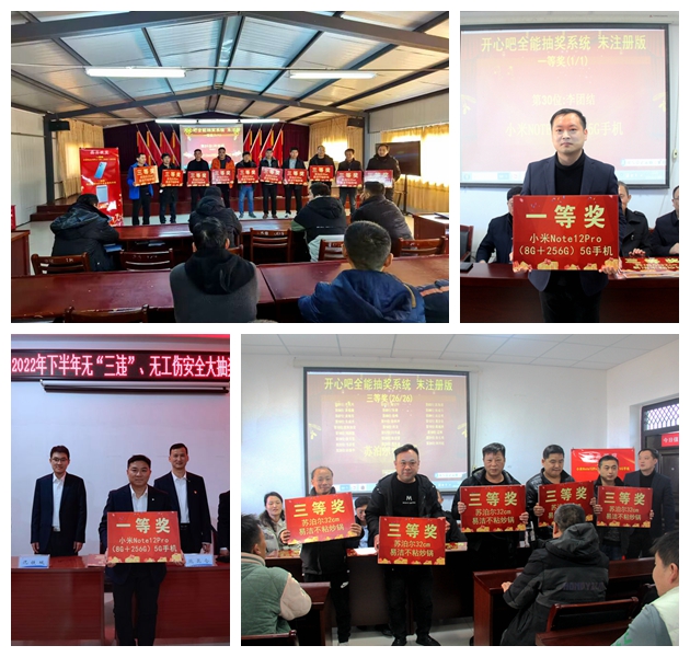 为进一步激发安全生产正能量,让职工远离“三违”,奏响“安全是最大幸福”最强音,助力安全生产“三步走”目标行动深入开展,2月27日,工程处同时在14家基层单位开展了无“三违”、无工伤安全大抽奖活动,此次大抽奖共设一等奖18名、二等奖36名、三等奖300名、鼓励奖若干,让去年下半年全处2102名无“三违”、无工伤职工分享安全红利。