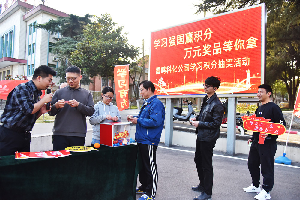 为进一步提升党员团员在“学习强国”和“青年大学习”平台上的学习动力,从而提高党员团员政治素质,增强党团的凝聚力和战斗力,3月14日,雷鸣科化公司在办公楼广场举办了“学习有为,强国有我”为主题的学习积分抽奖活动。该项活动共购置奖品10余种,奖品金额近2万元,共有80名党员团员获得了此次抽奖资格。(撰稿:刘栋 审核:高亚光)