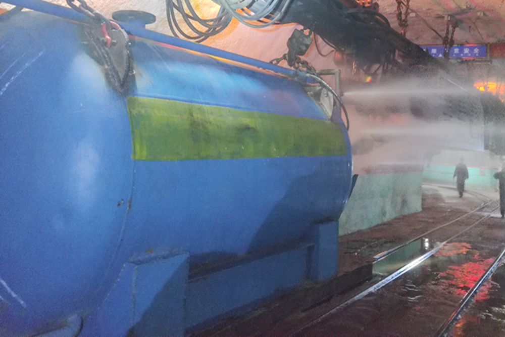该列巷道洒水单轨吊机车采用的是一套自主研发的可摘挂式装置组件,主要由大容量耐压水箱、加压泵、蓄电池组件、扇形喷淋装置及电控组件构成,有效喷洒半径大于5米,喷洒工效是人工工效的8倍以上,喷洒覆盖面大、除尘效果好、喷洒效率高。