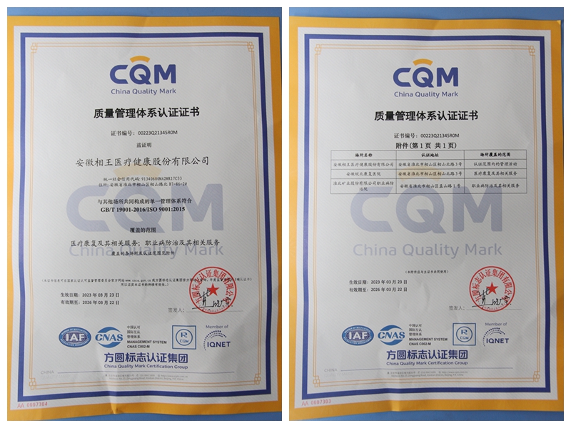 顺利通过再认证审核,标志该公司在医疗康复、职业病防治过程中的质量标准化建设上又迈出了坚实的一步。下一步,该公司将一如既往地严格执行质量管理体系及相关规章制度,不断推动质量管理标准化、规范化、流程化,切实提升医疗服务水平。