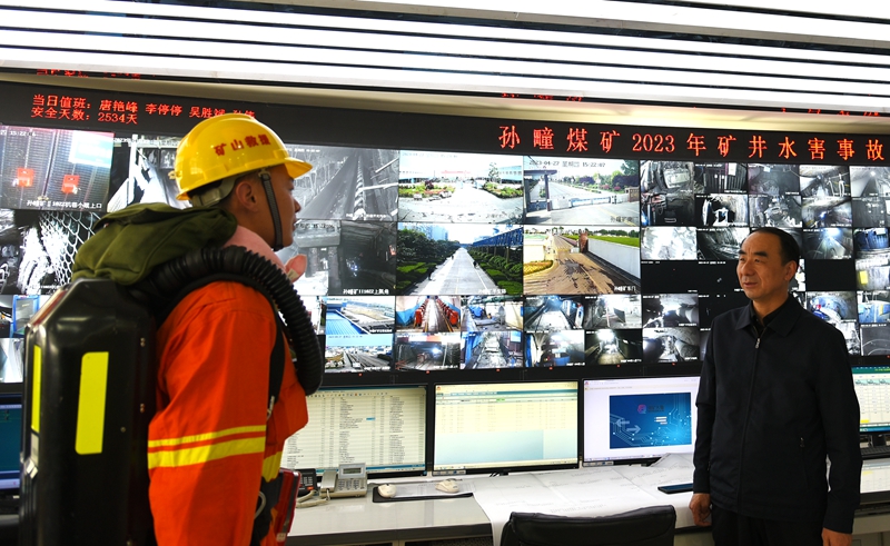 4月27日,中班,孙疃矿当值调度员徐斌接到井下“紧急”电话,一边紧盯“出事”地点视频画面,一边发号指令。这是4月27日,孙疃矿开展实战化水害事故应急演练的模拟现场之一。