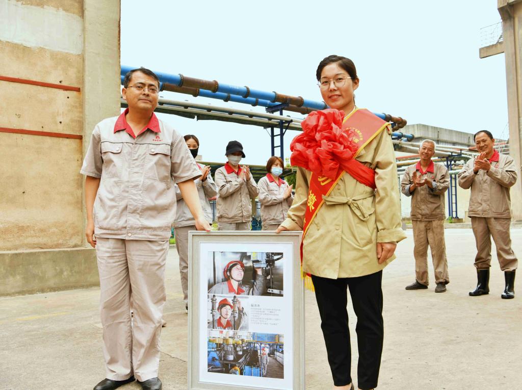 图为临选厂工会为三名劳模披上大红绶带、系上大红花,送上“最美劳动者”精美相片