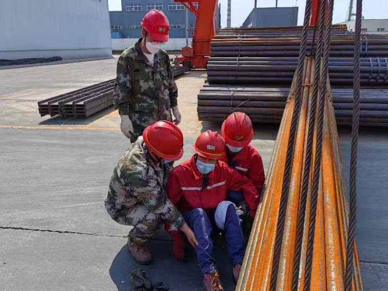 演练情节为:钢材场地龙门吊驾驶员在作业过程中钢丝绳断裂,导致货物坠落压倒旁边的职工致其受伤,仓储配送中心迅速启动应急救援预案,现场实施疏散、救援等应急处置。因职工伤势较重,演练总指挥立即提高响应级别,组织车辆紧急救援,并向上级领导报告事故情况。